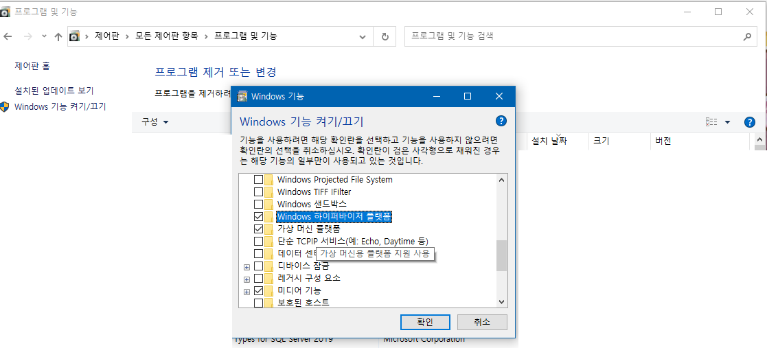 - 가상 머신 플랫폼: 이 옵션 역시 체크합니다.