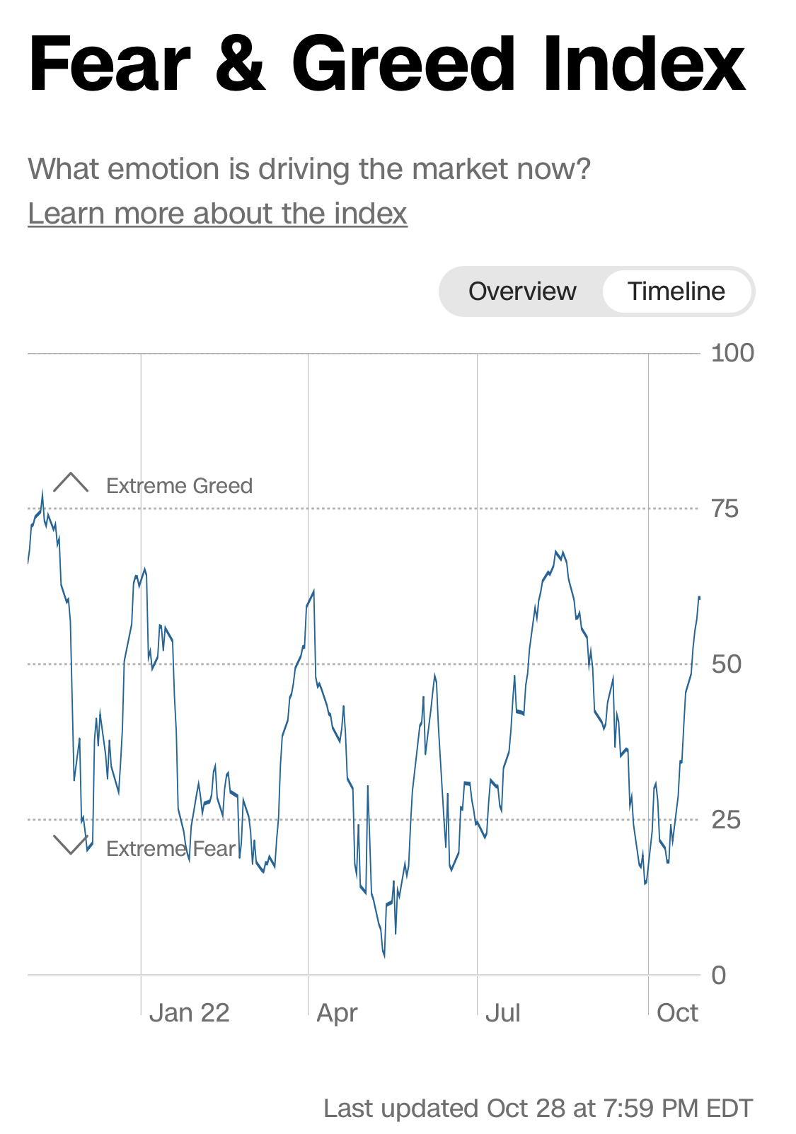 미국 공포 탐욕 지수 2022.10.30 61 탐욕 : 나스닥 인버스 슬슬 담을 때가 오고 있다. https://www.cnn.com/markets/fear-and-greed Fear and Greed Index - Investor Sentiment | CNN The market is made up of thousands of stocks. And on any given day, investors are actively buying and selling them. This measure looks at the amount, or volume, of shares on the NYSE that are rising compared to the number of shares that are falling. A ..